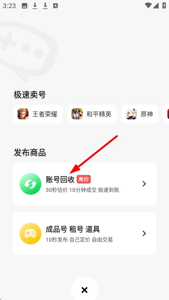 点击【账号回收高价】选项,即可参与30秒估价、10分钟成交的账号回收流程。