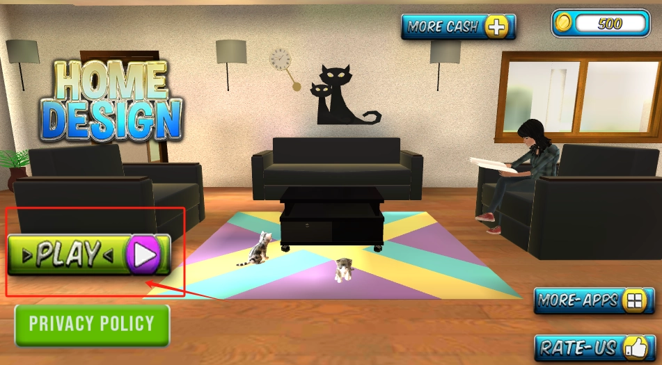 点击红色的PLAY按钮就能开启游戏啦,你可以用500金币来布置客厅,比如摆放沙发、铺上地毯,还能养可爱的宠物哦。