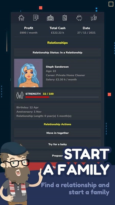 游戏设有时间推进机制,角色会随着游戏进程中的时间流逝不断成长变化,完整展现从青年时期求职打拼,到中年阶段遭遇危机,再到步入退休生活的人生历程。