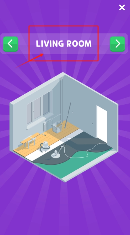 按左右箭头就能切换房间,客厅里有吸尘器和木地板,你可以打扫卫生或者布置这里。