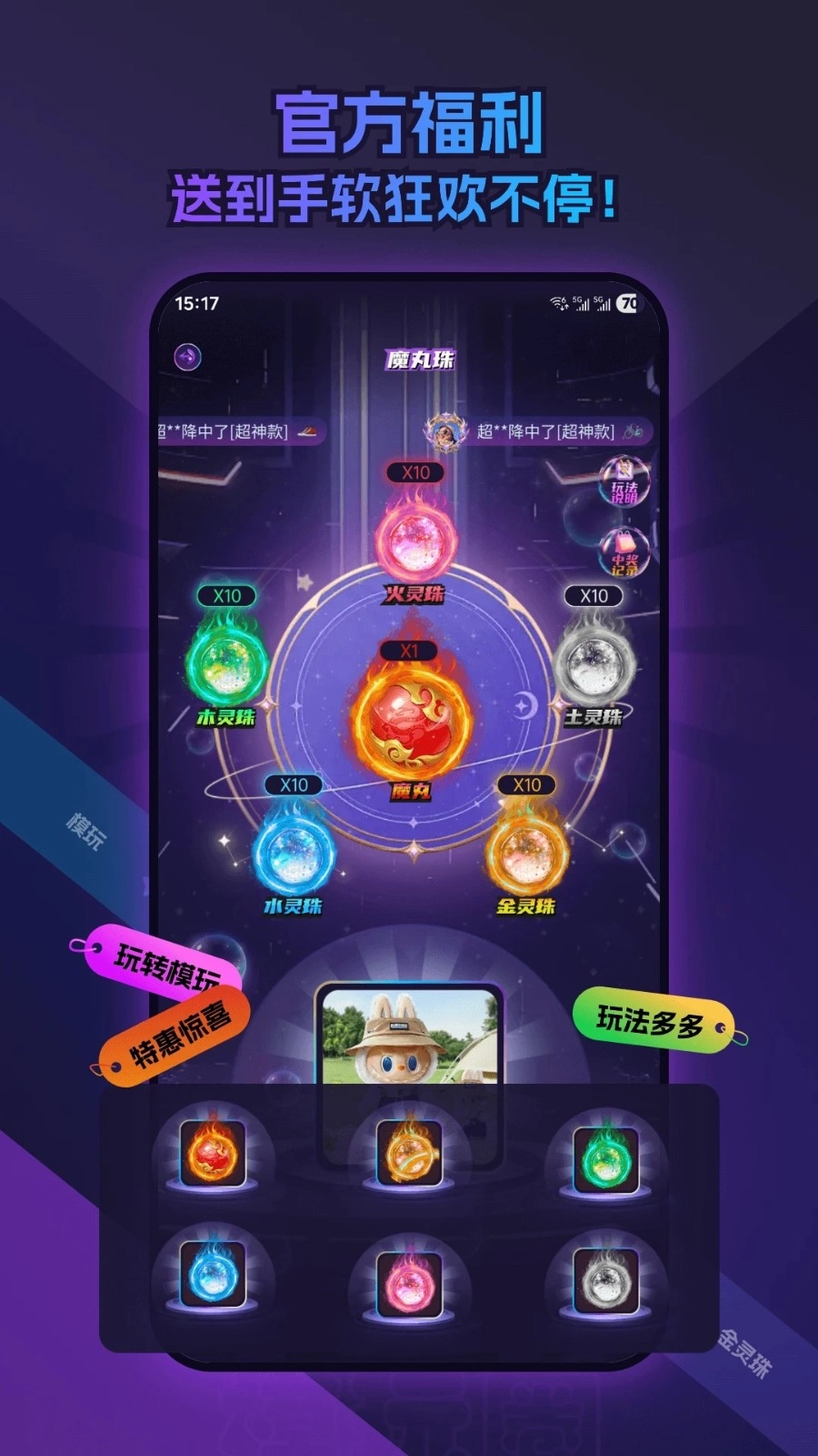 3、模玩页面设有爬塔、私人房间、抽卡机、魔丸珠和CS GO挑战赛等版块;