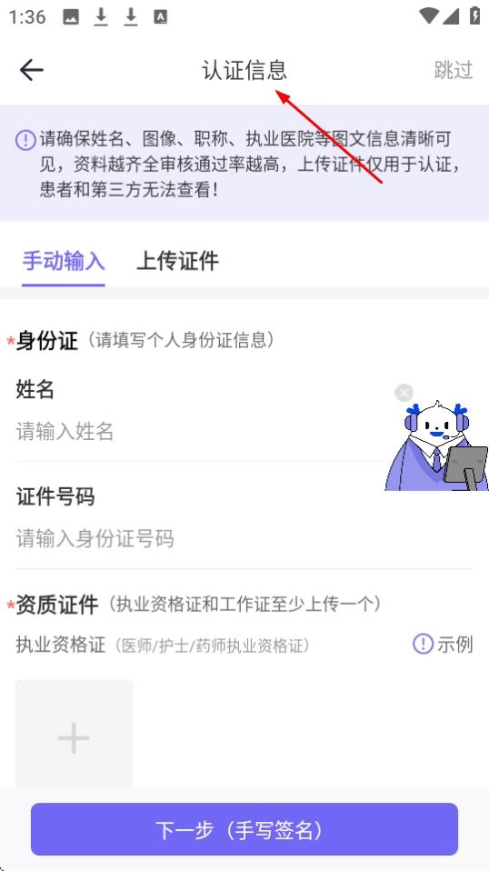 在【认证信息】页面,需填写【身份证】对应的姓名与证件号码,上传【资质证件】后,点击【下一步(手写签名)】按钮,即可完成认证流程。