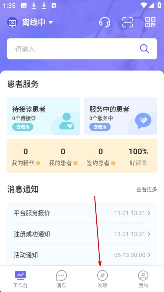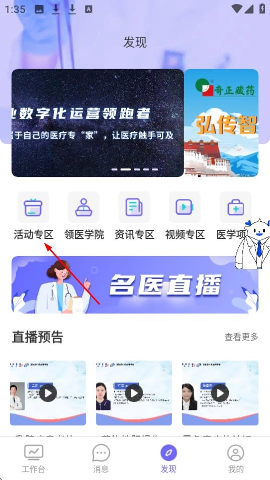 在工作台页面,点击【发现】按钮,就能进入发现页浏览各类专区以及直播预告等相关内容。