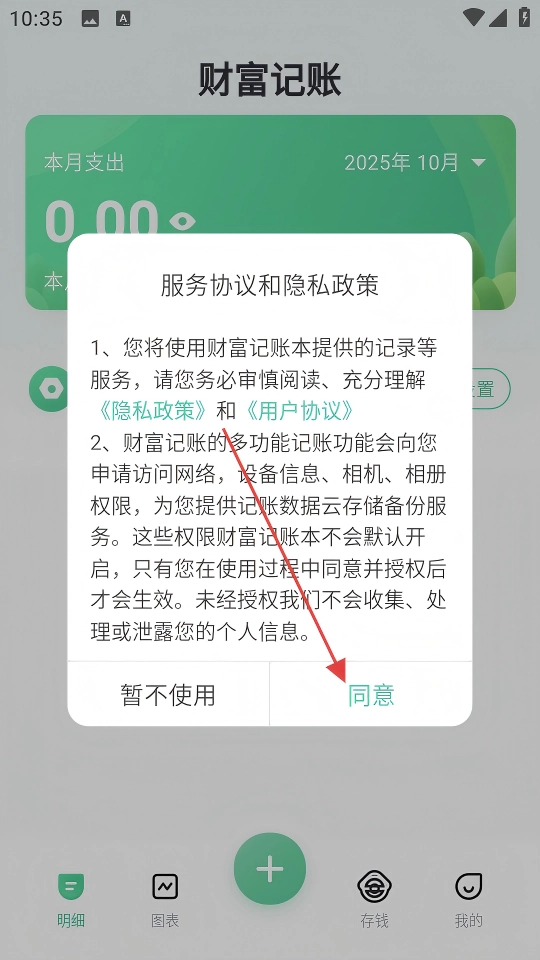 打开财富记账应用,待弹出【服务协议和隐私政策】窗口后,点击其中的【同意】按钮,即可进入应用的主界面。