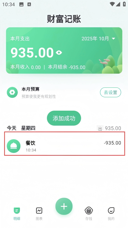 提交后会回到主界面,在那里能查看已添加的记账明细,至此一次记账操作就完成了。