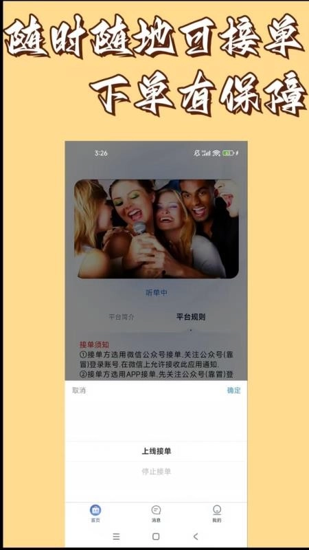 1、保持在线状态并打开靠冒,完成注册登录操作后,即可在线进行接单和下单;