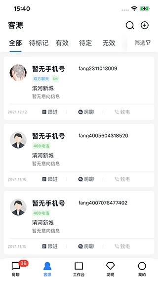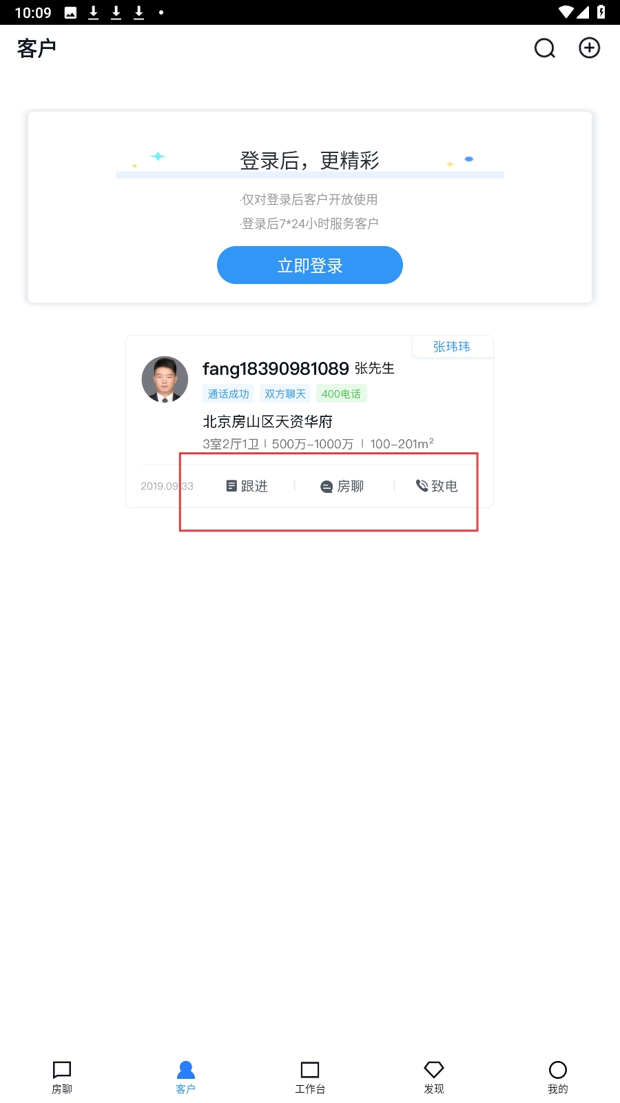 在客户页面,点击客户卡片上的【跟进】【房聊】【致电】按钮,即可开展对应的客户互动操作。