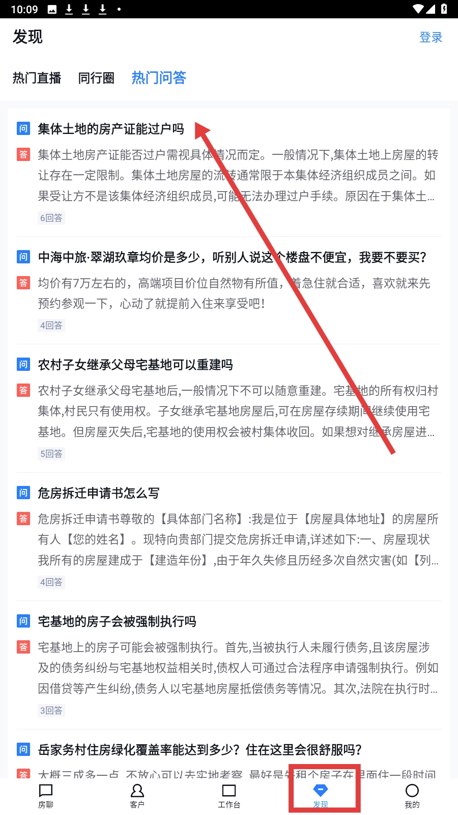 点击底部导航栏的【发现】图标,进入发现页面后,就能浏览热门问答以及其他房产相关的资讯内容。