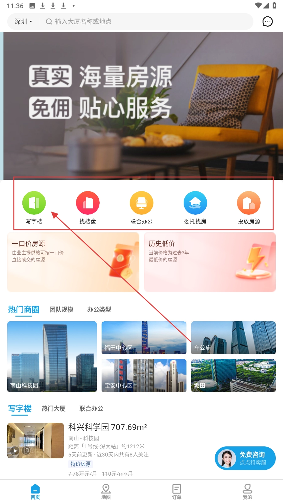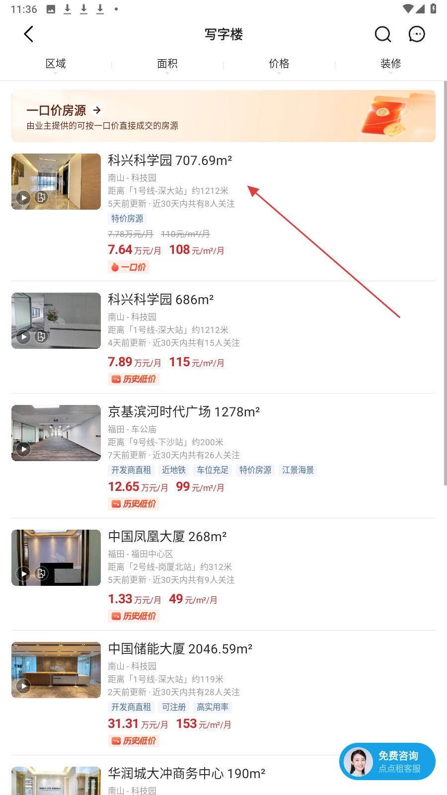 点击首页的【写字楼】图标后,就能进入写字楼房源页面,在这里可以根据区域、面积、价格等条件对房源进行筛选。