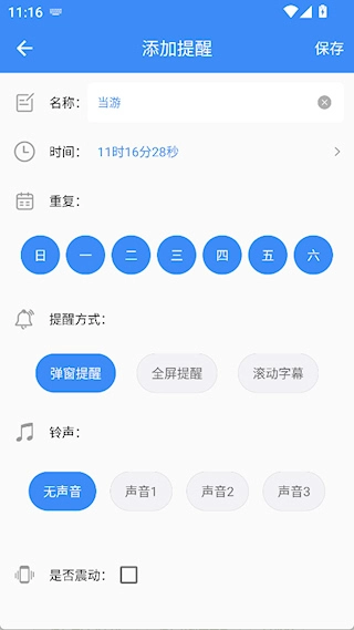 2、输入名称,设置时间、重复与提醒,点击保存