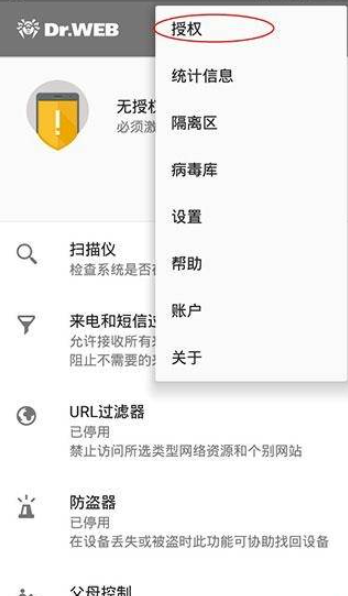 1、启动程序,初始状态显示为“无授权”,点击界面右上角的菜单按钮,从中选择“授权”这一选项