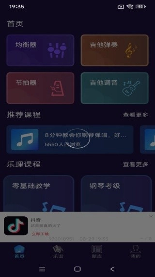 2、首页推送功能丰富多样,涵盖均衡器、吉他弹奏、节拍器以及吉他调音等实用工具。