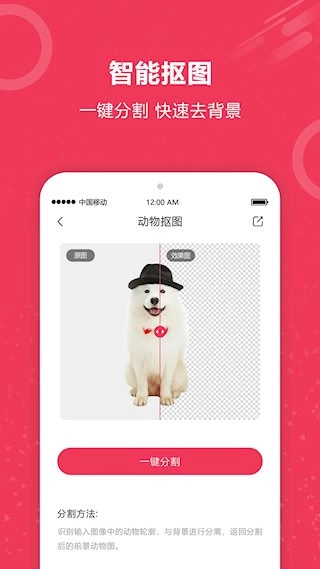 3、操作界面做到了极致简化,主体识别和背景去除只需一键就能完成。还能实时预览处理效果,并且支持通过手势缩放来查看细节。