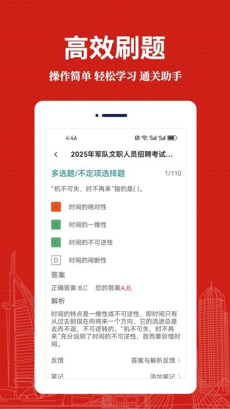 军队文职易题库是一款整合历年真题与全新题库的刷题学习工具,致力于为军队文职备考用户提供更便捷、更全面的刷题学习支持,让用户能随时开启灵活自由的刷题体验。平台覆盖多科目题库,一站式满足备考学习需求;多样化的刷题模式,适配专项突破与全面提升的练习场景,助力用户高效提升知识储备、掌握各类题型答题技巧,确保学习效率;详细的个人学习数据,可清晰呈现答题效果,便于用户分析学习状况并开展针对性提升。正在备考的伙伴,欢迎通过军队文职易题库免费版共同学习。