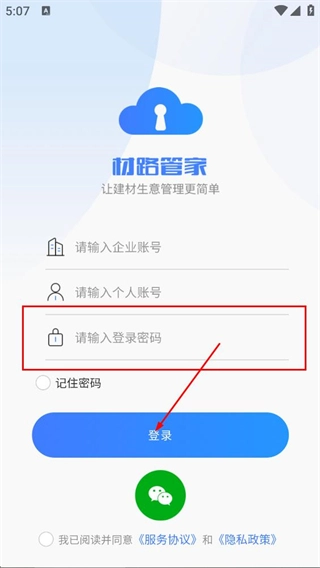 在材路管家的登录界面,可选择填写企业账号或个人账号对应的相关信息。