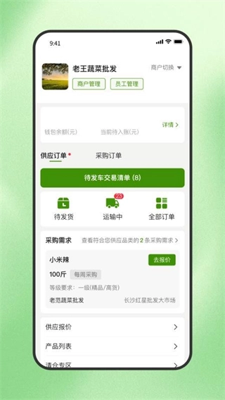 天天新鲜是专门面向商家的农产品线上交易平台,它整合了全国各产区农产品批发中心的资源,覆盖果蔬、肉禽、蛋、水产等全品类生鲜产品。平台采用安全可靠的供需对接模式,商家既能在线发布需求,也能快速匹配到合适的供应或采购方;同时还会实时同步商品价格,动态展示价格变化趋势,帮助商家及时把握市场商机。此外,平台支持一站式完成供货与采购的全流程操作,让农产品交易变得更加轻松高效。