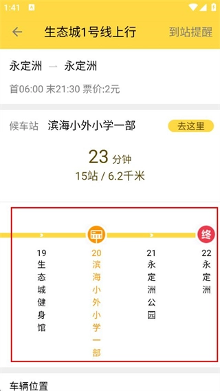 在生态城1号线上行线路的详情页面,能够查询到该线路的站点设置、列车到站时间、乘车票价等相关信息。