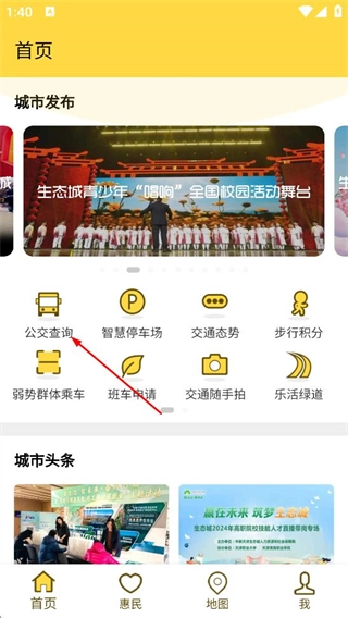 在应用首页找到公交查询选项并点击,这样就能进入生态城智慧公交的线路列表页面了。