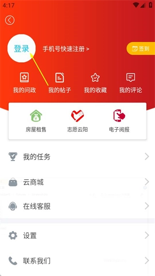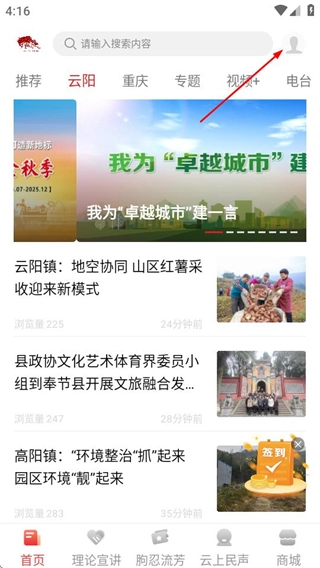 在理响云阳首页,点击右上角的头像图标,就能进入个人中心页面。