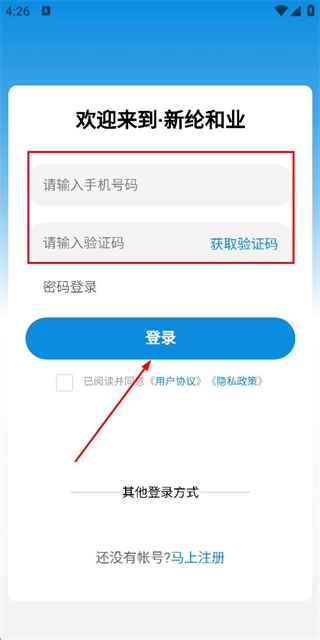 在登录界面输入手机号与验证码,勾选相关协议后,点击登录按钮即可完成账号登录流程。