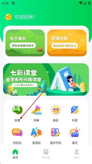 在七彩课堂的首页,找到功能区里的“故事”选项并点击,即可进入故事列表页面。