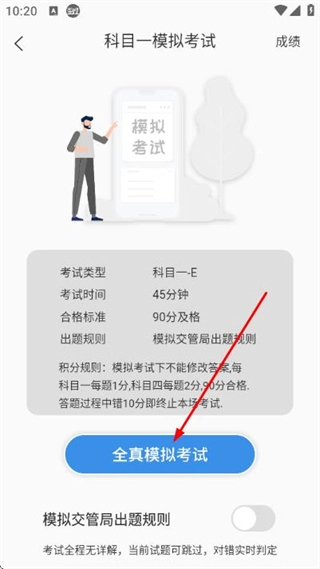 在科目一模拟考试的页面上,找到并点击“全真模拟考试”按钮,这样就能进入到模拟考试的答题界面了。