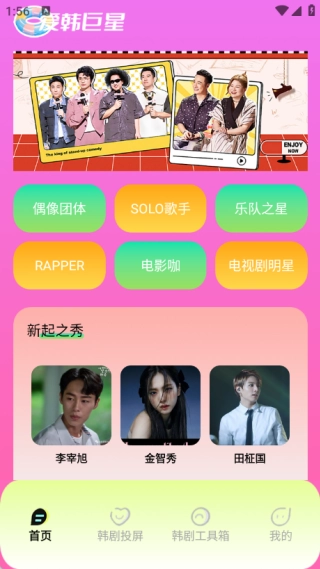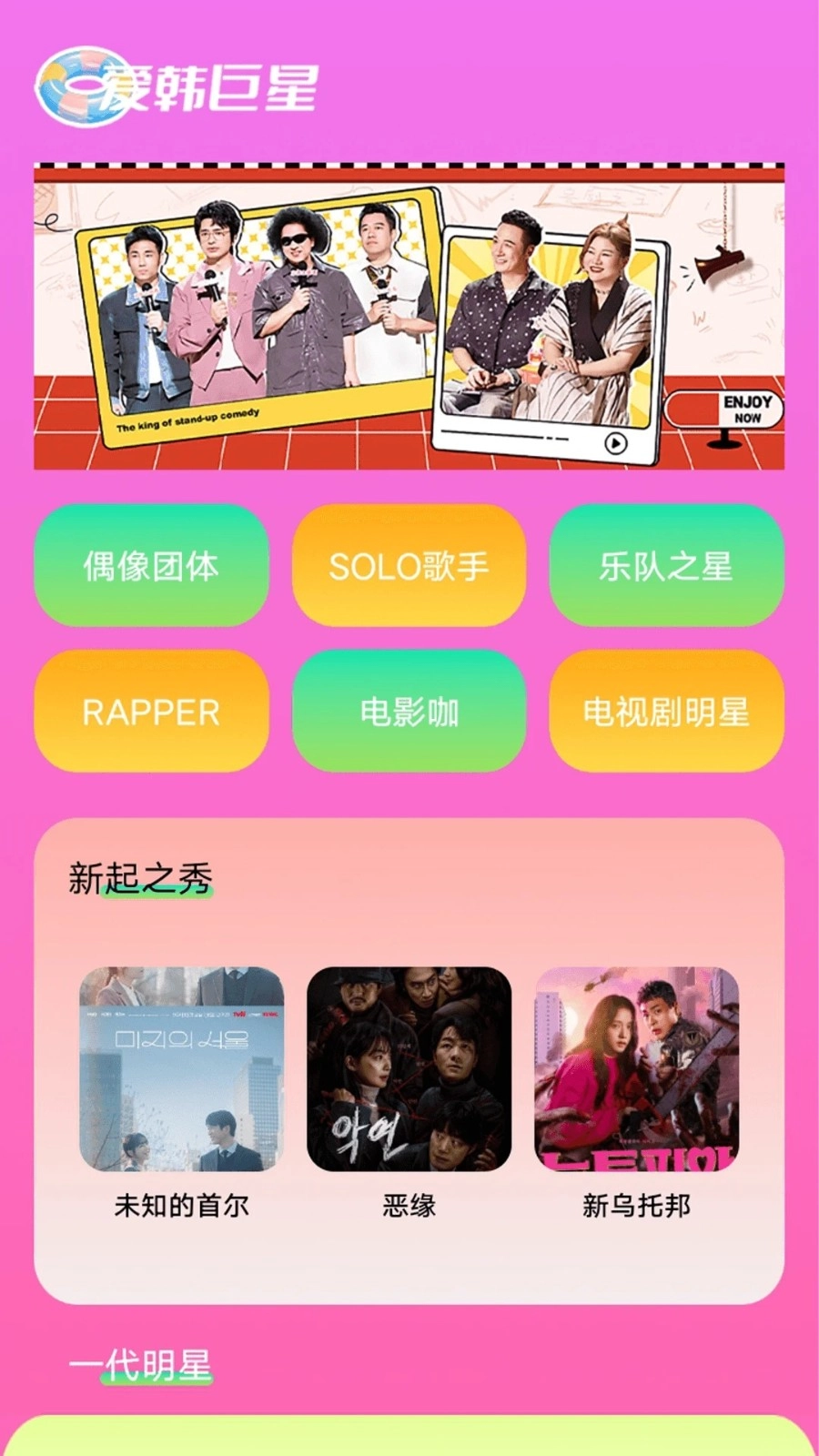 1、首页设置了爱韩巨星的多个版块,涵盖崭露头角的新起之秀,以及一代明星、二代明星等不同代际的明星内容;