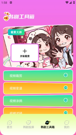 4、韩剧工具箱页面集成了视频裁剪、视频变速、视频倒放、视频涂鸦、视频滤镜等多种功能。