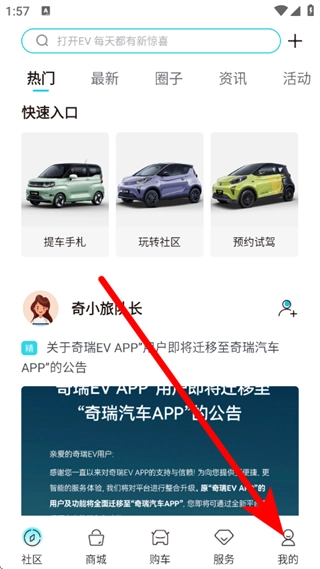 奇瑞ev是奇瑞新能源车主的专属服务平台,核心整合了汽车资讯推送、车辆状态查询、用车知识科普、车主互动交流及专属服务预约等功能,适配日常用车学习、车辆动态掌握、车主经验分享等场景,助力车主“知晓资讯、查询车况、学习知识、结交车友”,为新能源车主提供精准实用的服务与内容支持,让用车生活更便捷、更丰富。