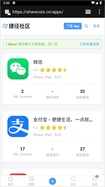 7、若不清楚URL Scheme的链接,可前往左上角的“捷径社区”进行查找,也能通过搜索引擎搜索App名称加上URL Scheme的方式尝试获取。