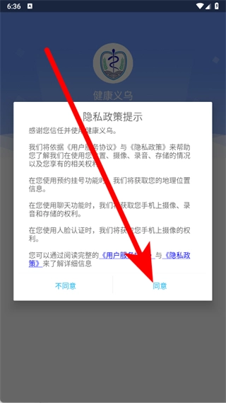 打开健康义乌挂号,在弹出的隐私政策提示弹窗中点击同意。