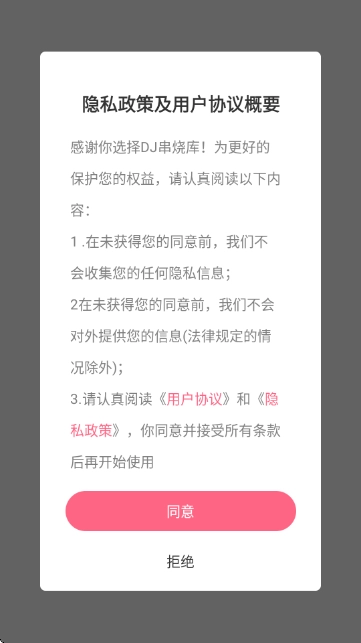 1、安装完成后打开应用,同意相关协议就能进入主界面,开启DJ串烧音乐之旅。