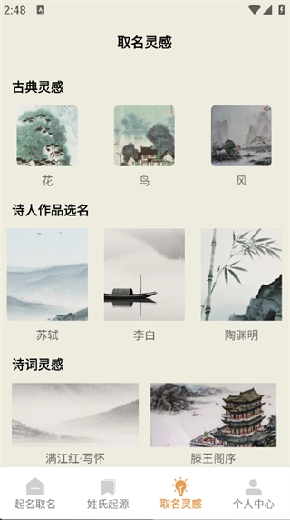 点击页面下方的“取名灵感”按钮,就能开启诗词浏览,获取更多创作灵感。