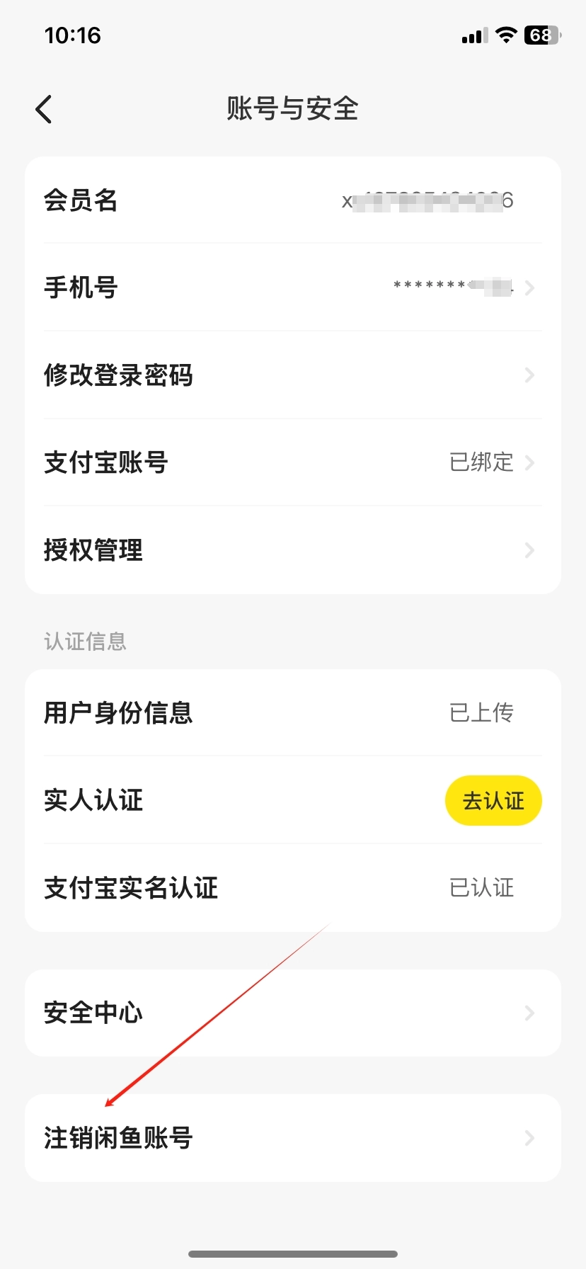3、在【账号与安全】页点击【注销闲鱼账号】。