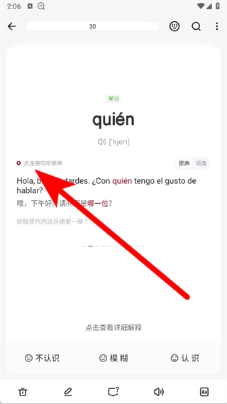 学习时,点击例词就能听到原声,借此聆听单词或例句的标准西班牙语发音,有助于熟悉发音规则。