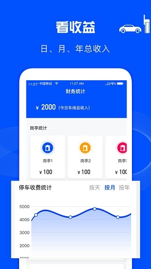能够随时查看每日收入、停车数量以及剩余车位等信息;