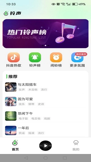 安装完成后,在首页界面,我们能够看到系统推荐的铃声素材,此外还有抖音热歌、铃声榜、闹铃榜以及更多氛围类板块。