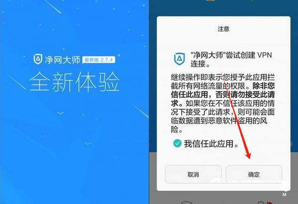 1、打开净网大师手机版,在“净网大师创建连接”的提示下方点击“确定”,操作示意如图。