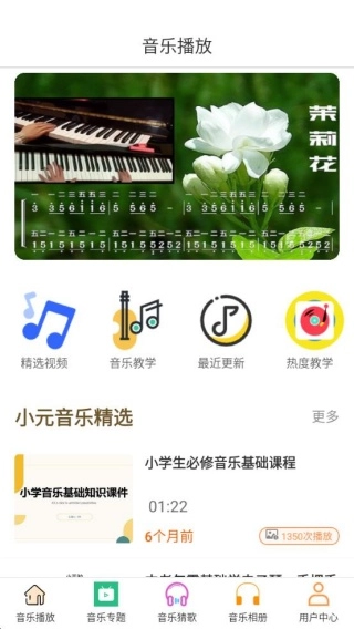 安装软件后进入音乐播放界面,这里有精选视频、音乐教学、最近更新、热度教学等内容可供使用。