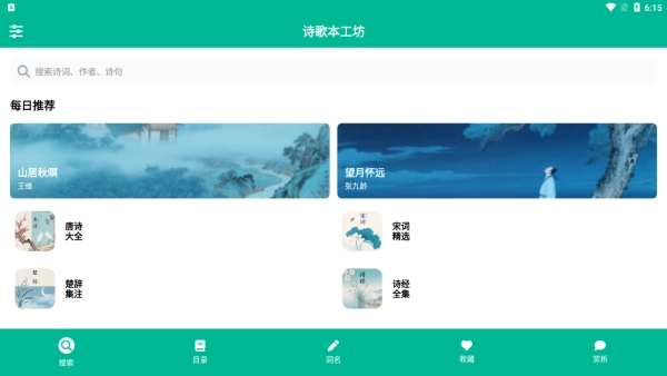 首页呈现的诗词资源十分丰富,并且支持多种便捷的搜索方式。
