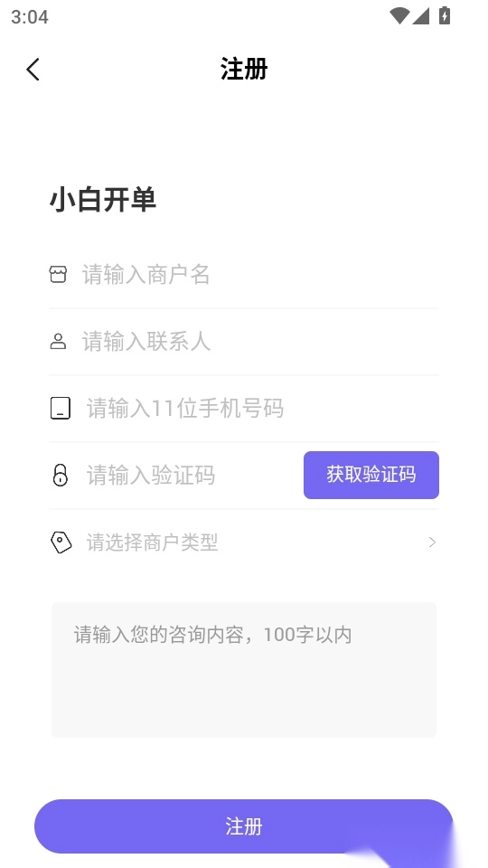 3.接着填写商户名称、联系人信息、手机号码、验证码,选择对应的商户类型并填写咨询内容说明,之后点击“注册”按钮进入后续流程