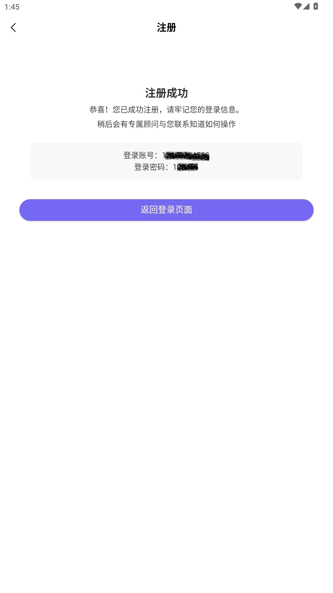 4. 随后会显示“注册成功”的提示界面,此时点击“返回登录页面”按钮,即可进入程序登录环节。