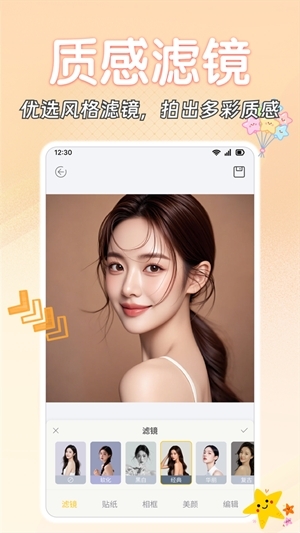 可以自由添加各类精品滤镜,让图片画面更显精美;还能搭配多种精品贴纸,尽情发挥创意随心调整,功能覆盖了丰富的软件使用场景。