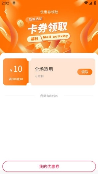 点击优惠券,进入卡券领取页面,随时都能便捷领取优惠券,购物时直接享受优惠省钱。