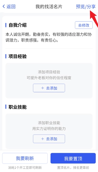 3、在我的求职名片里,填写自我介绍、项目经验、职业技能等内容,还能进行预览或分享。
