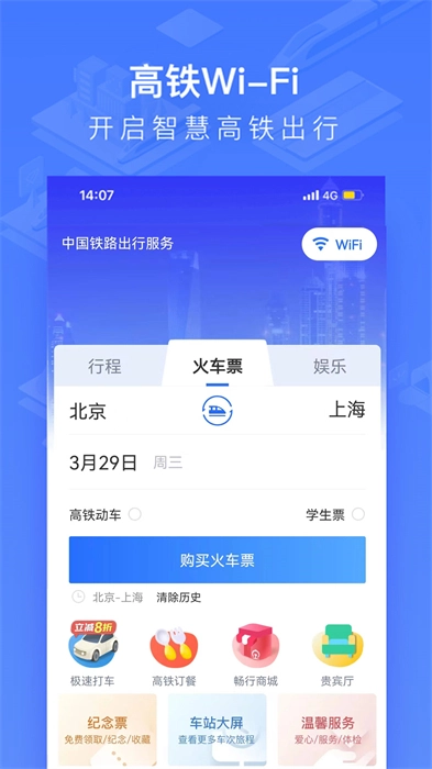 掌上高铁是中国铁路推出的出行服务平台,为铁路旅客提供线上线下协同的全流程出行服务,涵盖电子客票、订餐到座等车上服务,以及极速打车等特色联程服务。它覆盖了旅客出行中的吃、住、行、游、购、娱各个环节,旨在让旅客的出行体验更安心、更愉悦、更便捷。