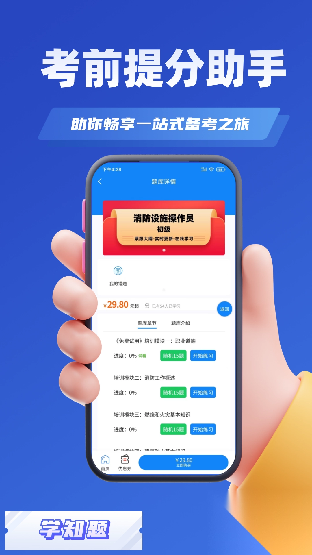消防设施操作员学知题是一款相当实用的题库学习手机应用,拥有大量优质模拟试题、往年真题以及配套课程资料,可全方位满足用户在线刷题、模拟测试和备考复习的需要,助力用户精准定位知识短板并进行针对性强化练习,全程为备考提供支持,有效提高考试通过几率。