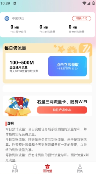 点击页面下方的“领流量”按钮,就能看到每日领流量的功能。