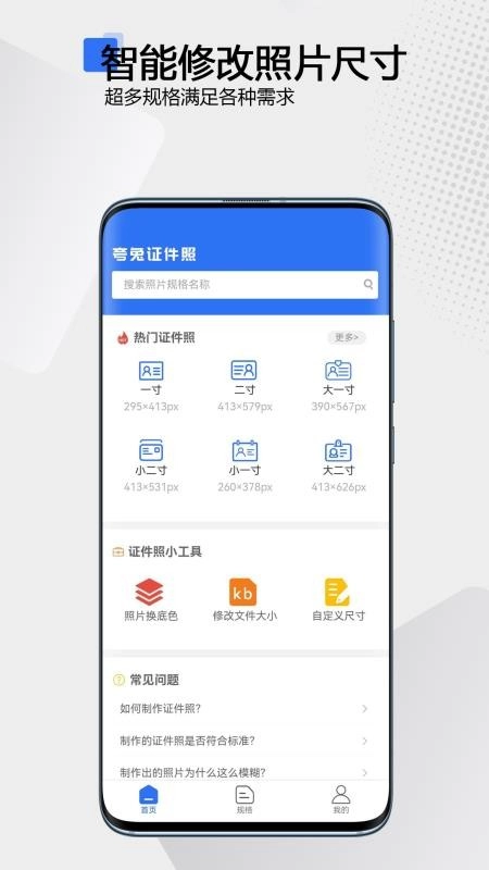 展示了常用的证件照尺寸规格,用户可以随心选择,轻松选择需要的尺寸规格。