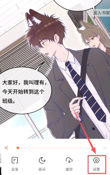 1、打开你想看的漫画,进入它的阅读页面,之后点击屏幕上的任意位置,再点击设置按钮。